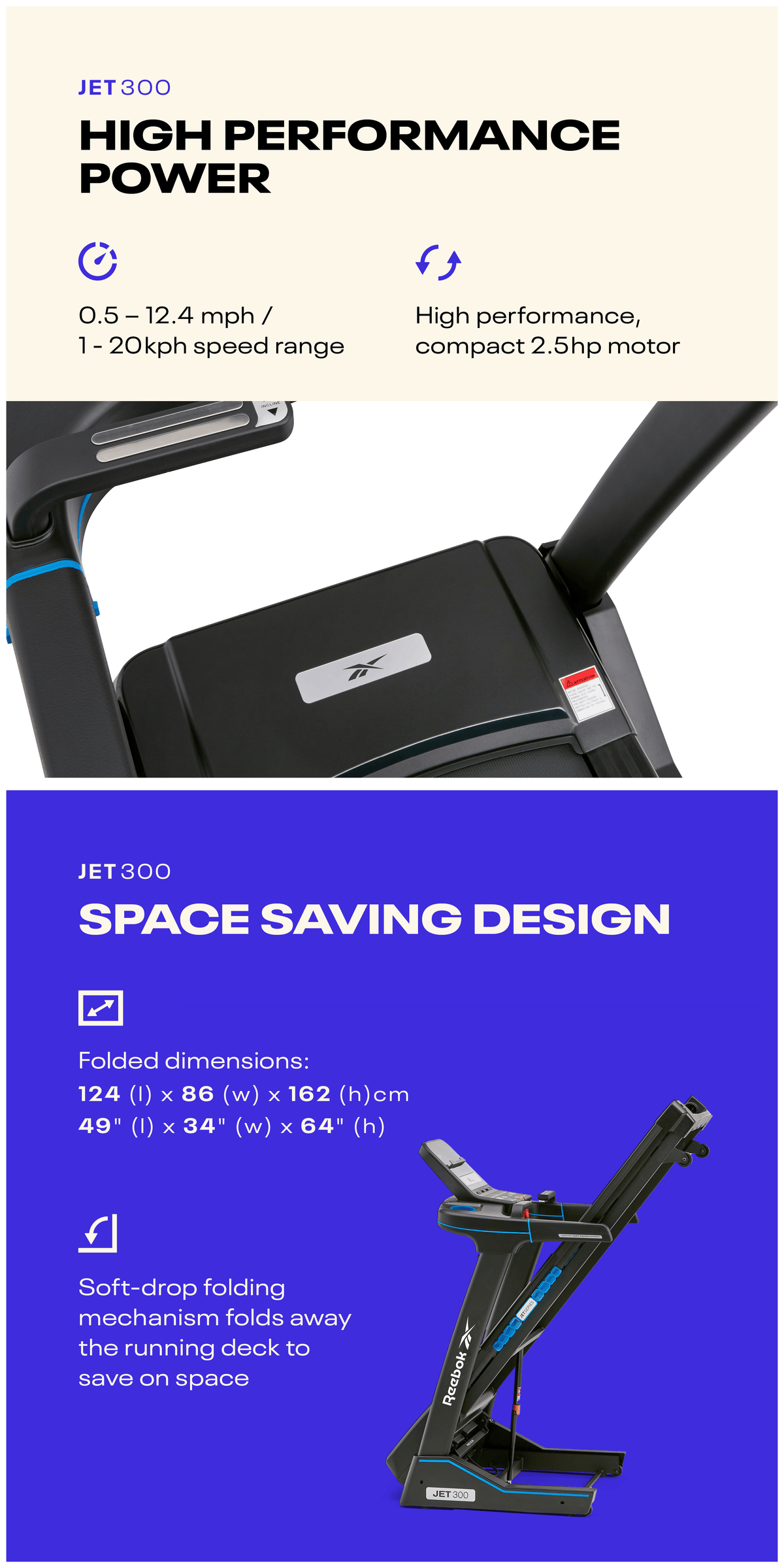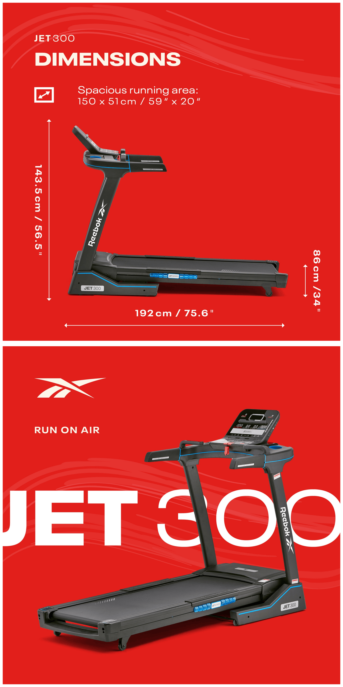 Equipped with a strong 2.5 HP motor at the heart of the treadmill, the Bluetooth Jet 300 delivers powerful and quiet performance with a top speed of 12.4 mph. Providing you with 15 levels of power incline to intensify your runs, the 300 delivers three user-defined, three heart rate control and three custom target workouts whilst 24 pre-set programs kick-start your regime straight from set up. Complete with integrated Air Motion Cushioning Technology, the uniquely designed pod structure transfers air through its eight sections to offer you support where it's needed - resulting in smoother and less abrasive exercise.