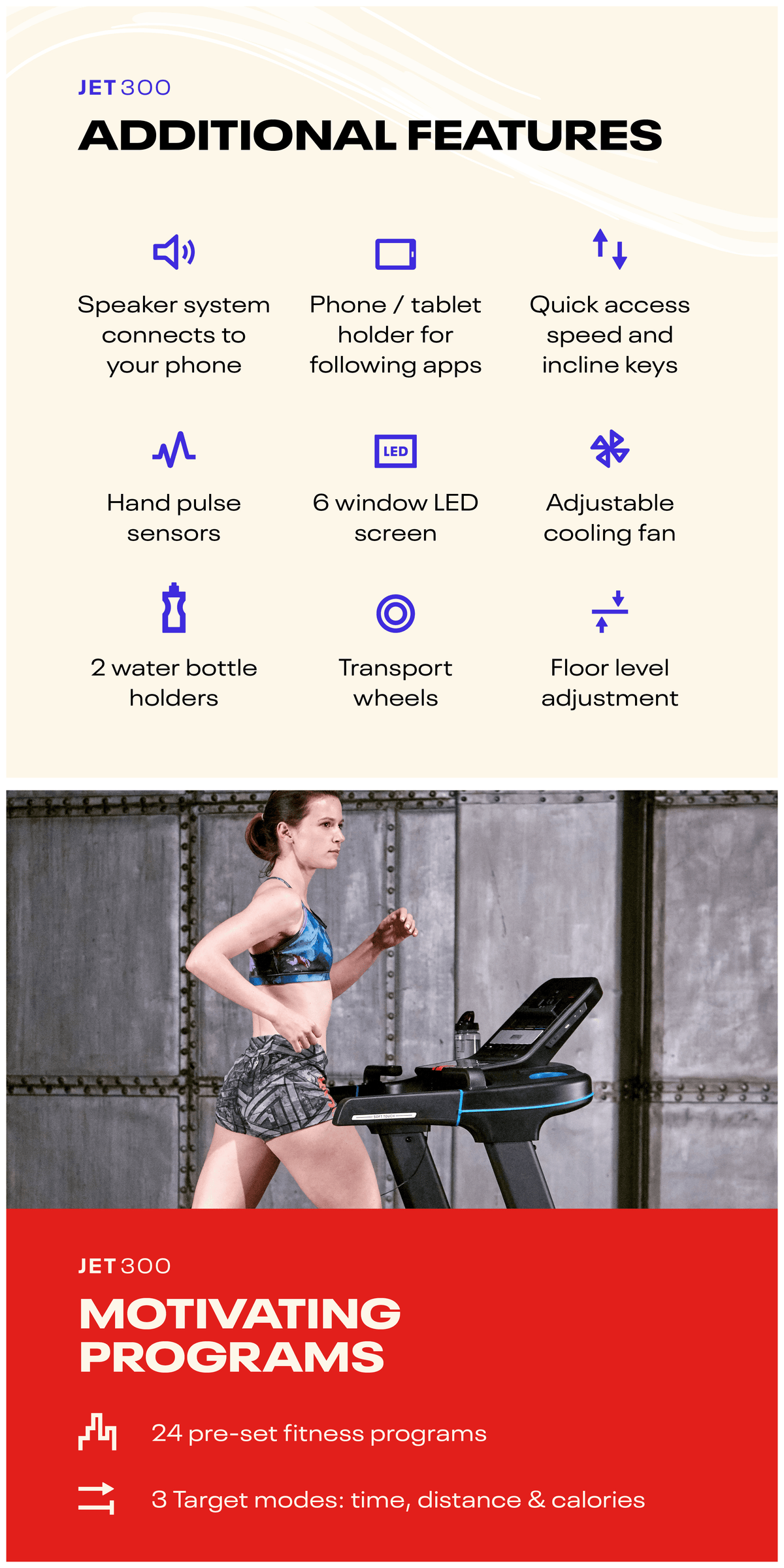 Delivering detailed real-time performance stats, the clear six-window LED screen + profile chart relays speed, time, distance and calorie metrics including heart-rate info straight from the treadmill's hand pulse sensors. Fitted with a smartphone/tablet holder atop the control console, the Jet 300 allows you to watch your favorite shows or listen to your training playlists through the integrated 5W speakers.