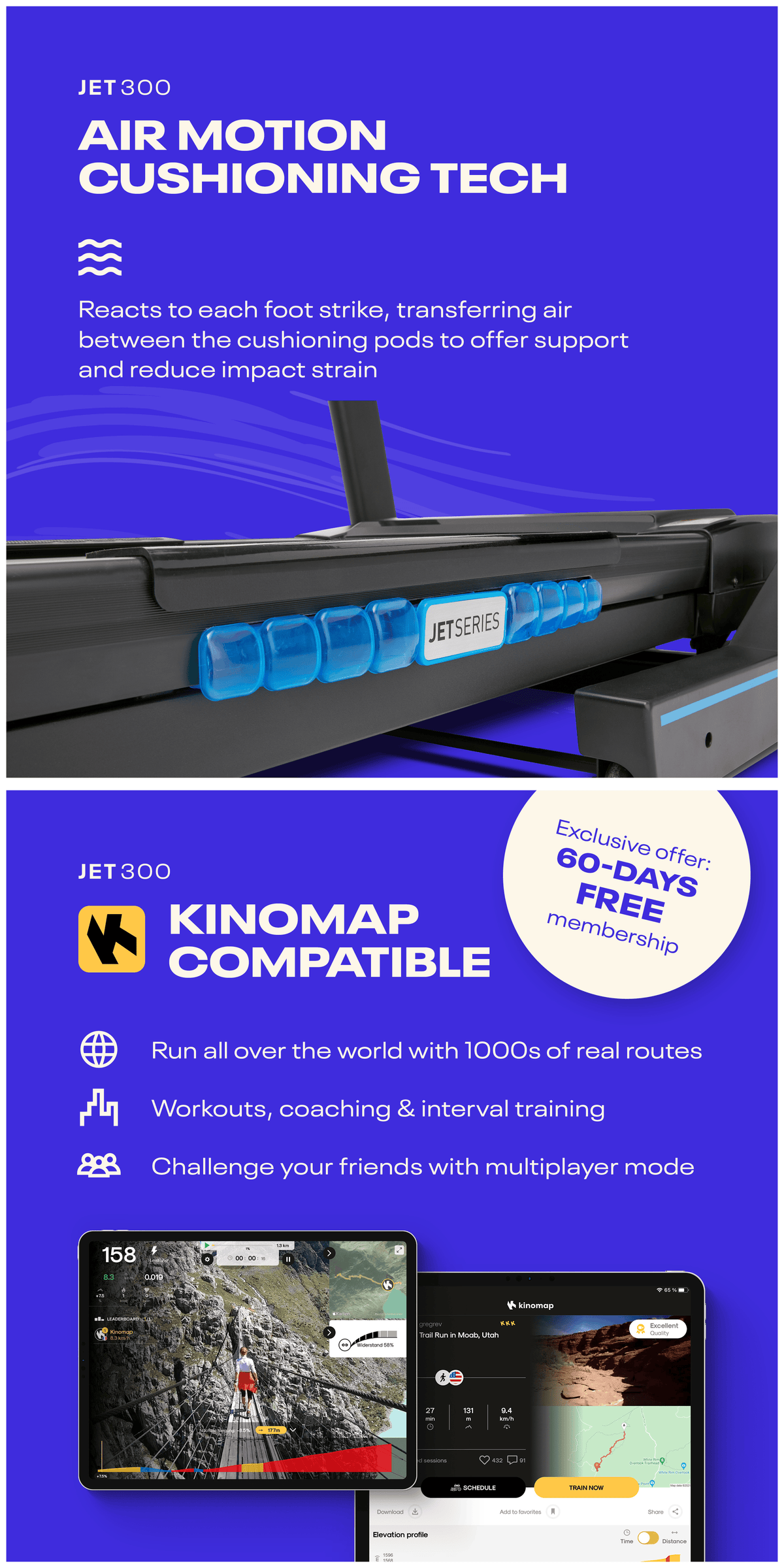 Compatible with Kinomap, the Jet 300 Treadmill helps to push your home workouts even further. With a whole host of challenges and scenic motion videos at your disposal, the Kinomap app helps you tailor and track your workouts from your phone, or even compete with your friends in multiplayer mode.