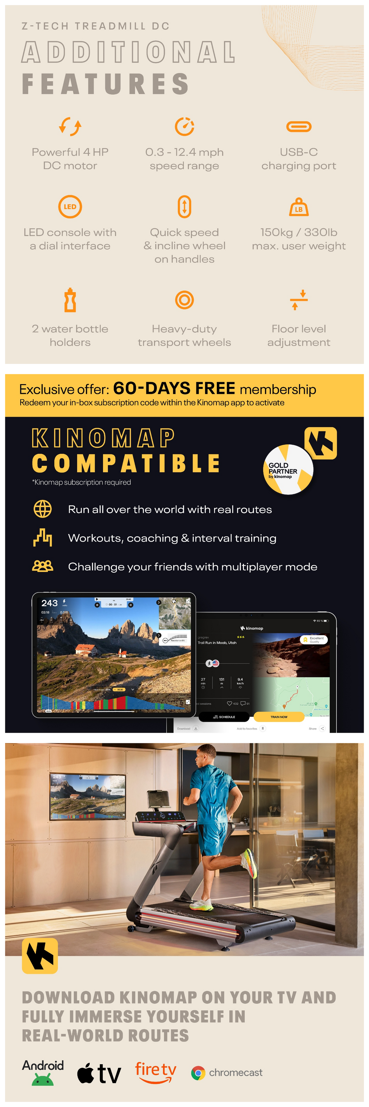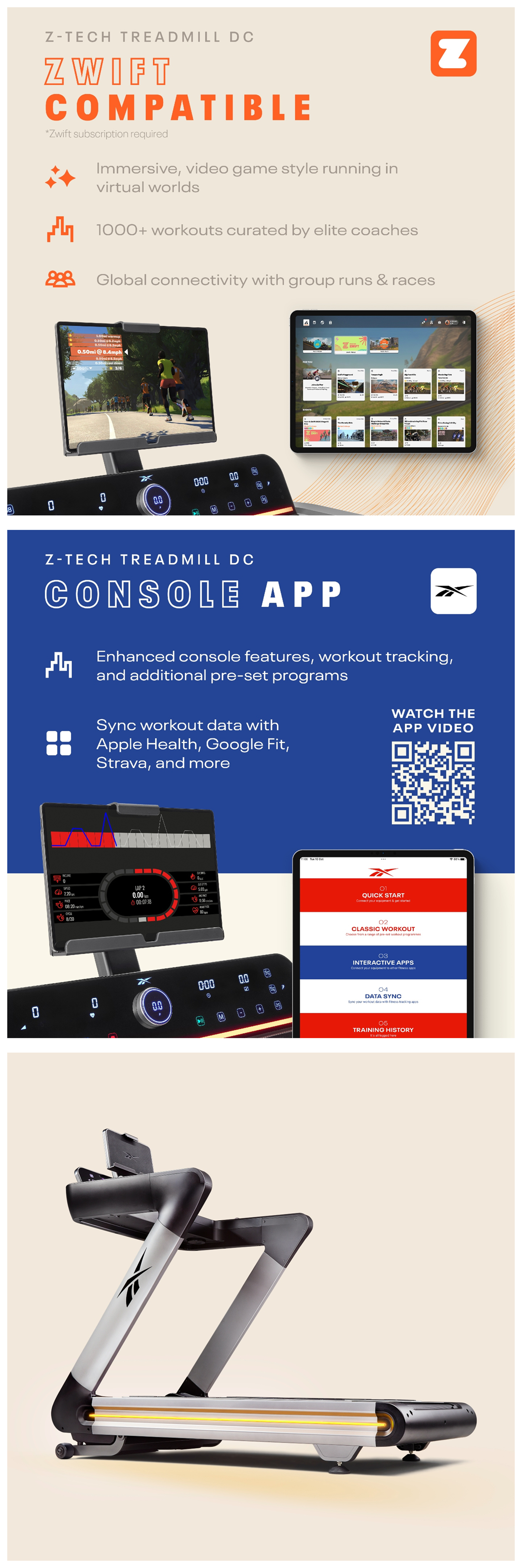 Compatible with Zwift, Kinomap, and the Reebok Console App, you’re able to access a whole world of immersive running experiences, training apps, and personalized workouts, all while documenting your performance with detailed training insights. From Zwift's gamified running community to Kinomap's real-world routes, unlock endless training possibilities with Z-Tech.