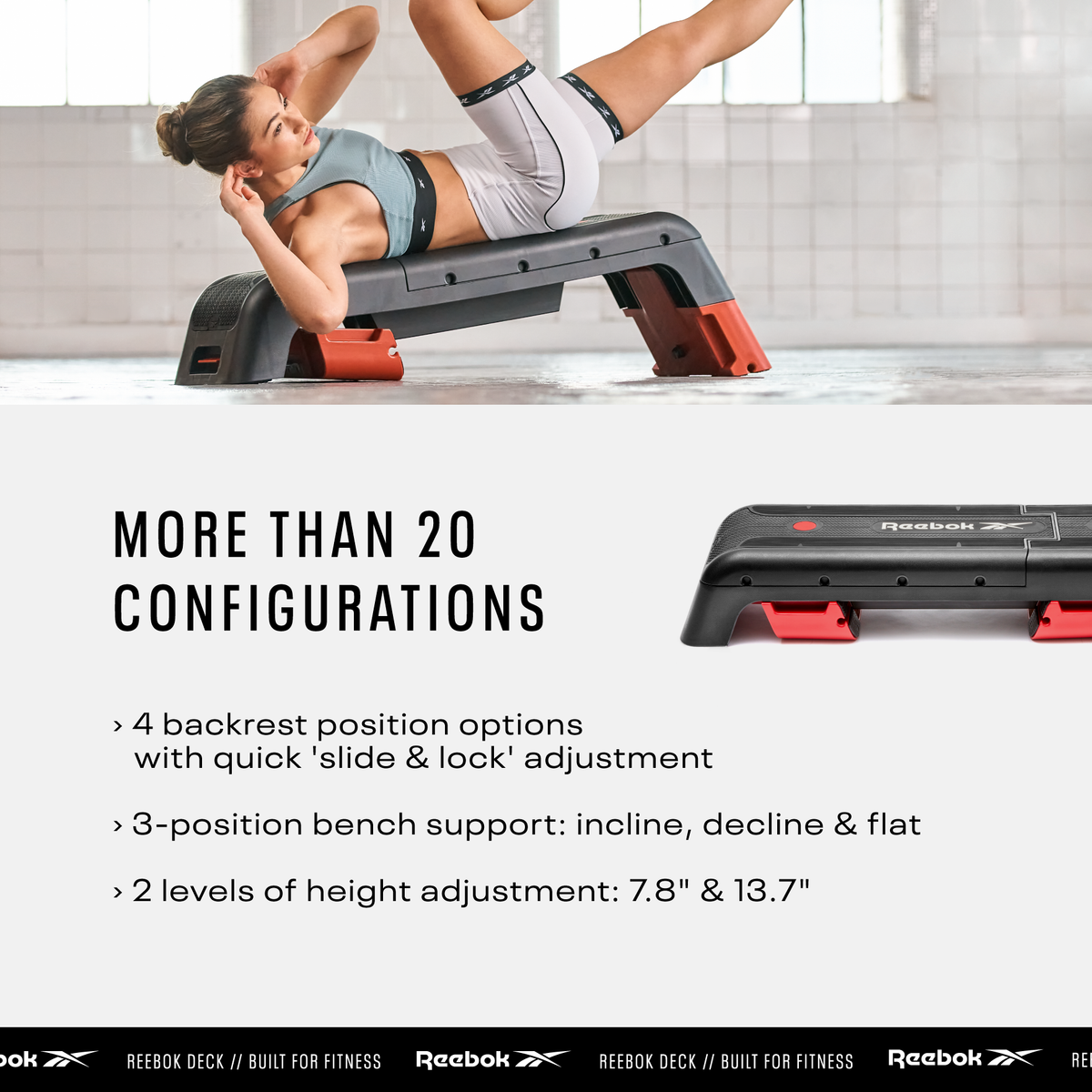 The latest generation of the hugely popular Reebok Deck continues to be one of the most versatile pieces of fitness equipment on the market today. Combining aerobic and strength training, the Deck’s unique configurable design provides you with total control over your workout. With more than 20 setup combinations, there are dozens of exercises that can be done. Ideal for all types of training, the Deck is a completely adaptable platform with incline, decline and flat bench configurations, including the ability to tilt the backrest into four adjustable positions.