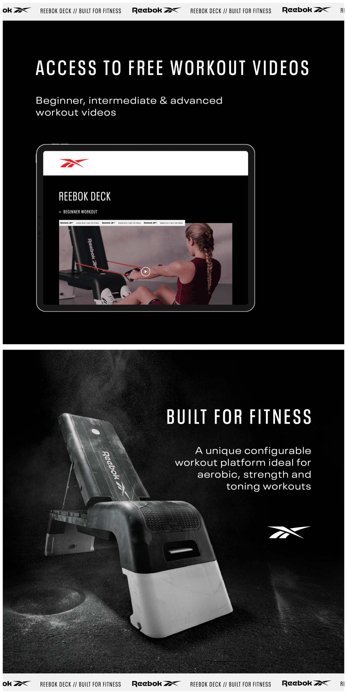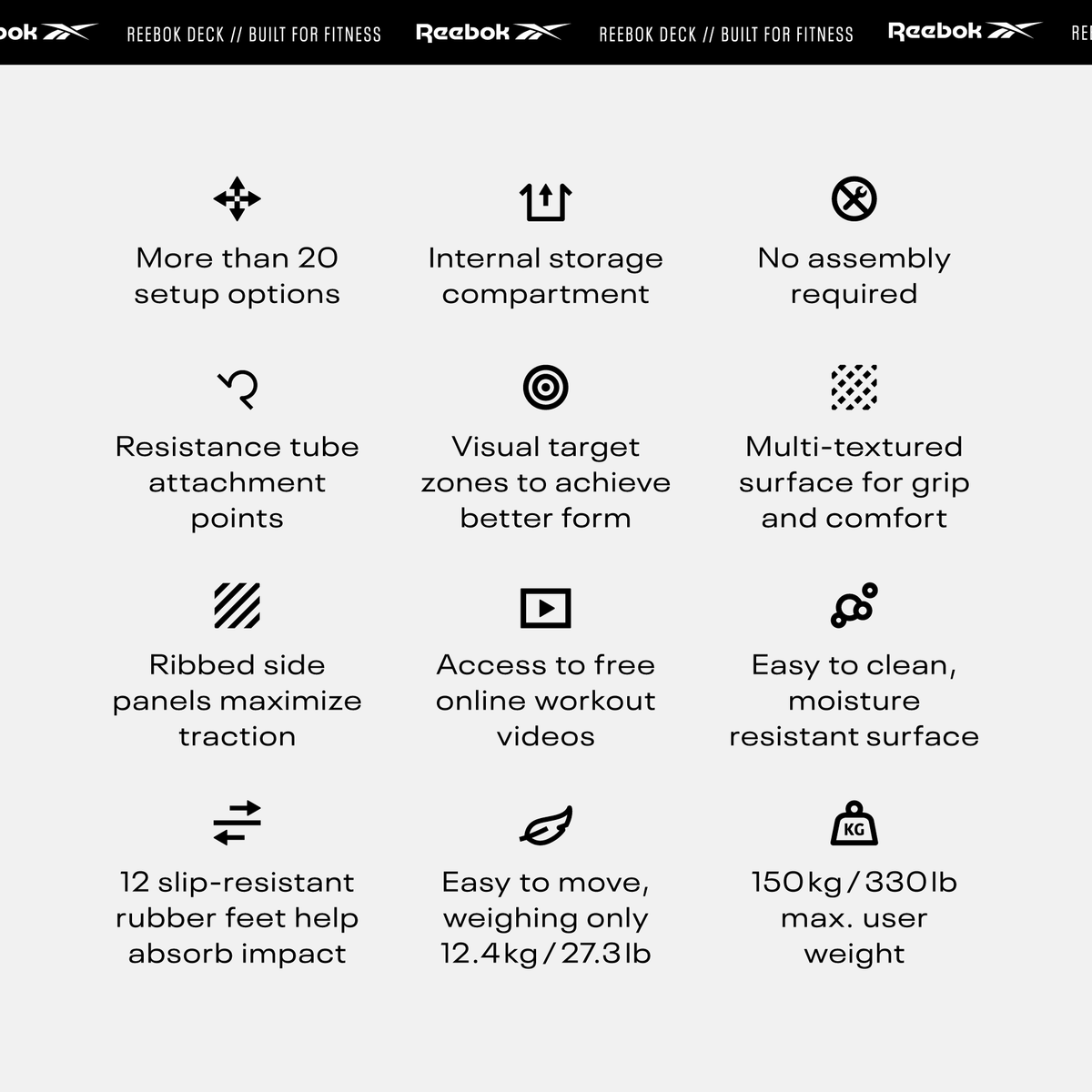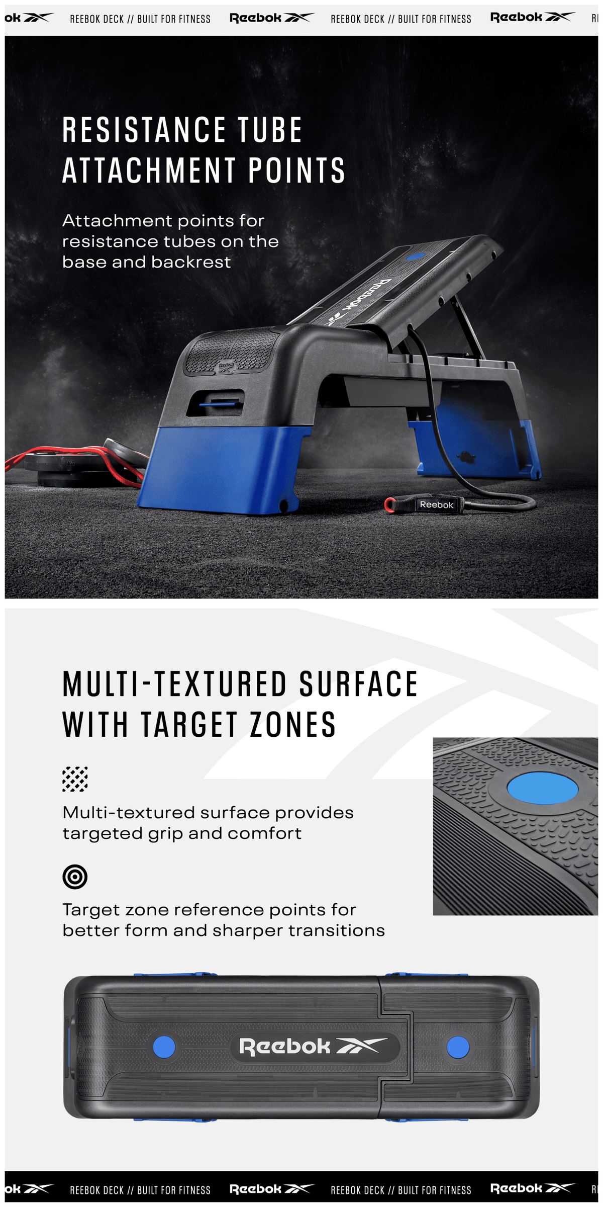 The Deck also offers two levels of height adjustment (20 & 35 cm / 7.8” & 13.7”) to further boost the intensity and diversify your exercise options. To help get you started you’ll have access to free online video workouts so you can get the most out of your new Reebok Deck. The multi-textured workout surface has been re-engineered to provide better-targeted grip and superior cushioned comfort over previous generations. The visual target zones create reference points for better form and sharper transitions, while the ribbed side panels deliver maximum traction on the outermost edges to give you the confidence you need for higher intensity workouts.