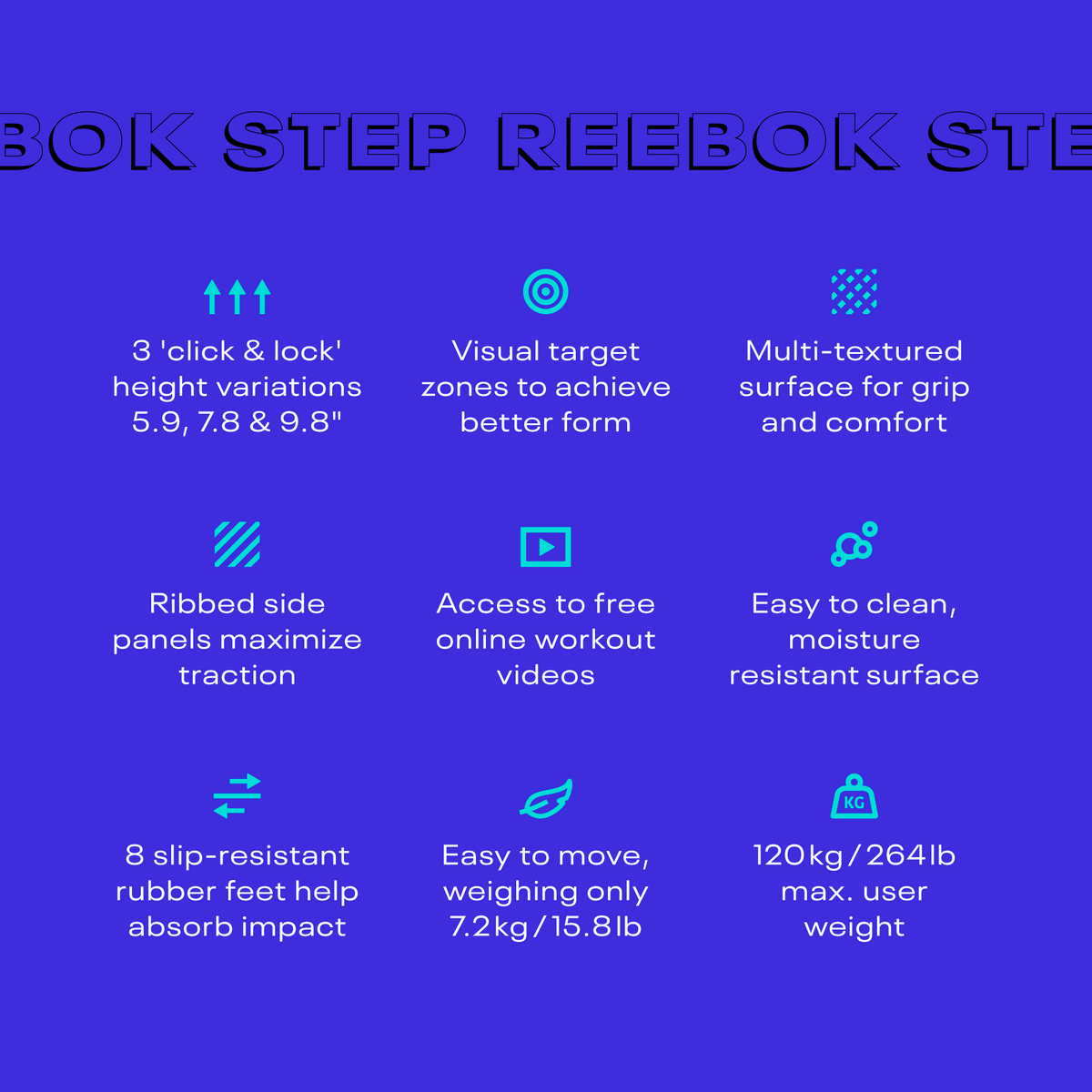 Ideal for home and class workouts alike, the Reebok Step's workout potential is only limited by your imagination. Fit for cardio, strength and core workouts; the Step's functional design lends itself to both HIIT and aerobics as well as more generalized fitness sessions. To help get you started you’ll have access to free online video workouts as well as the option to take a step back in time and take part in the original Step workout that started it all!